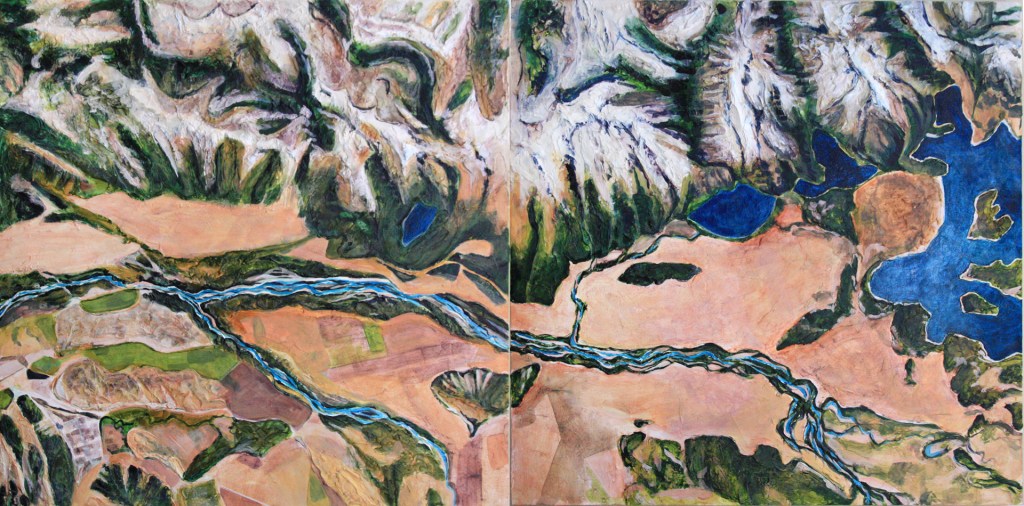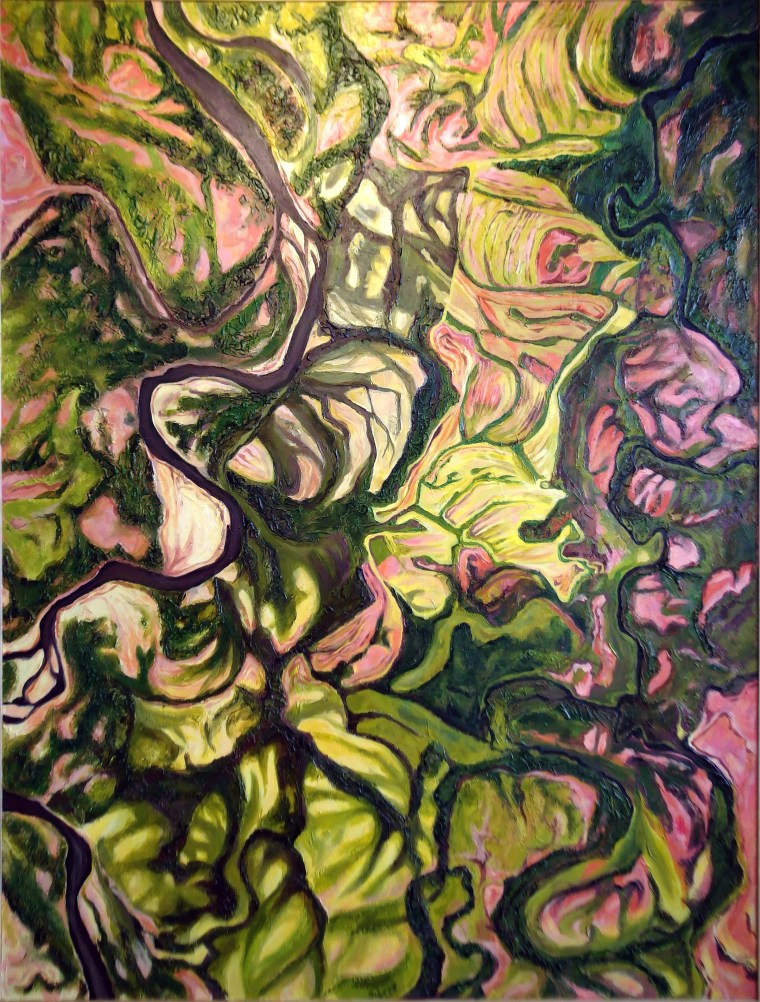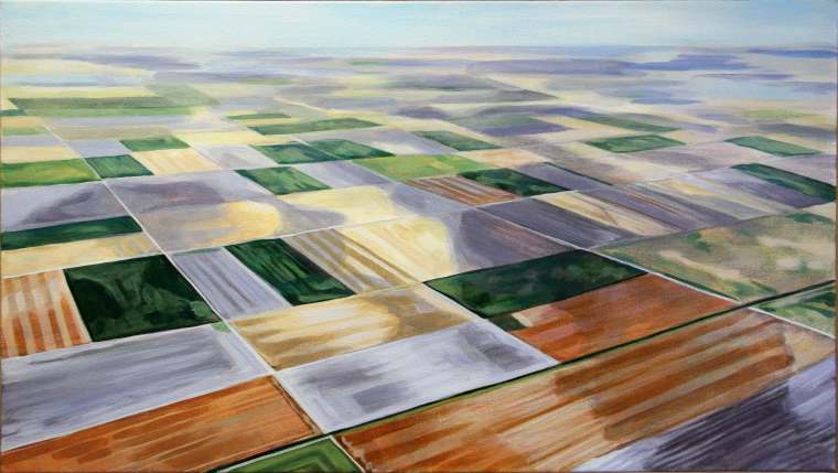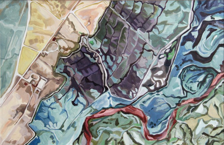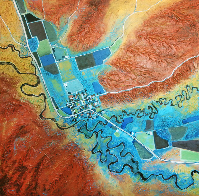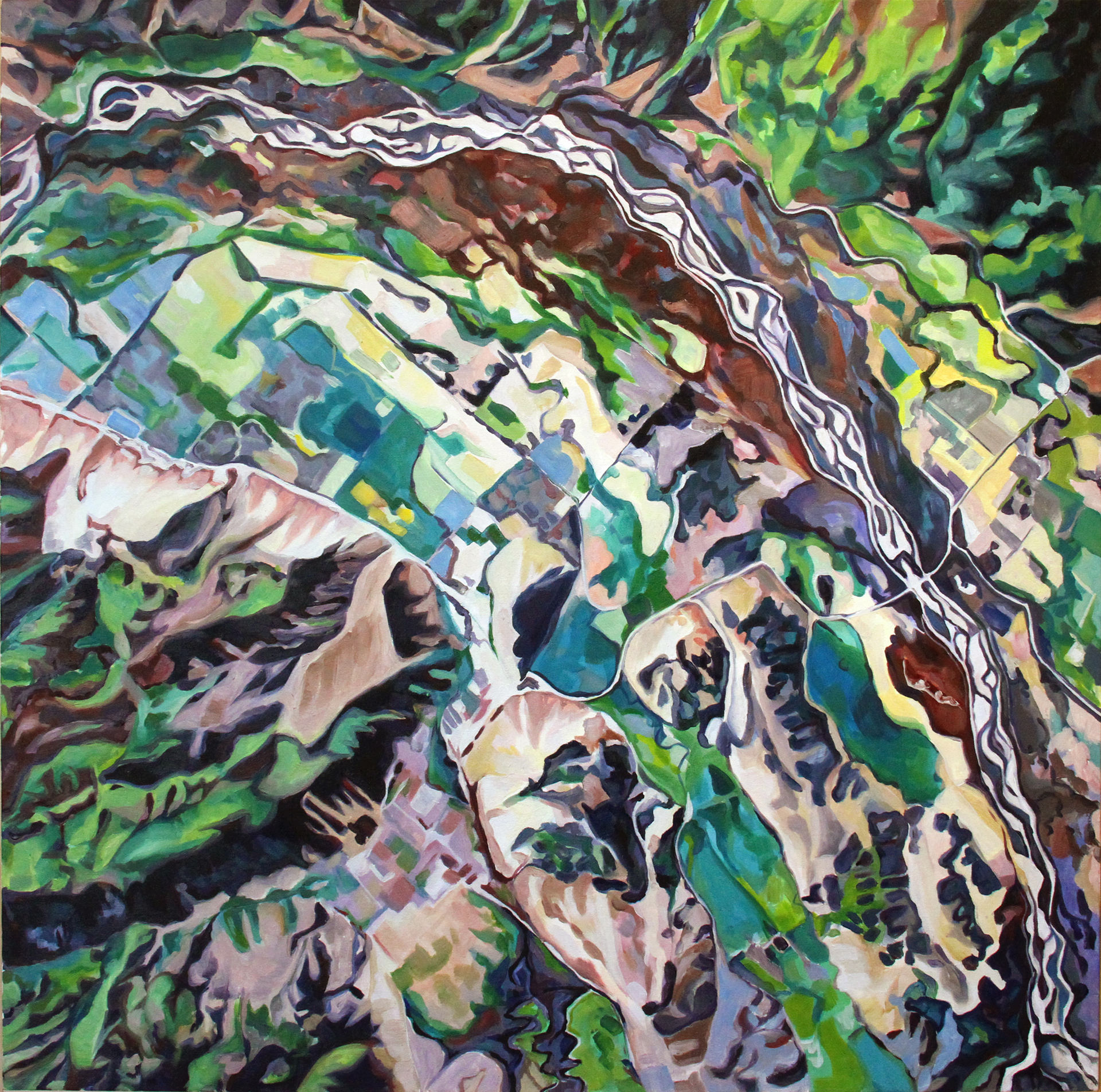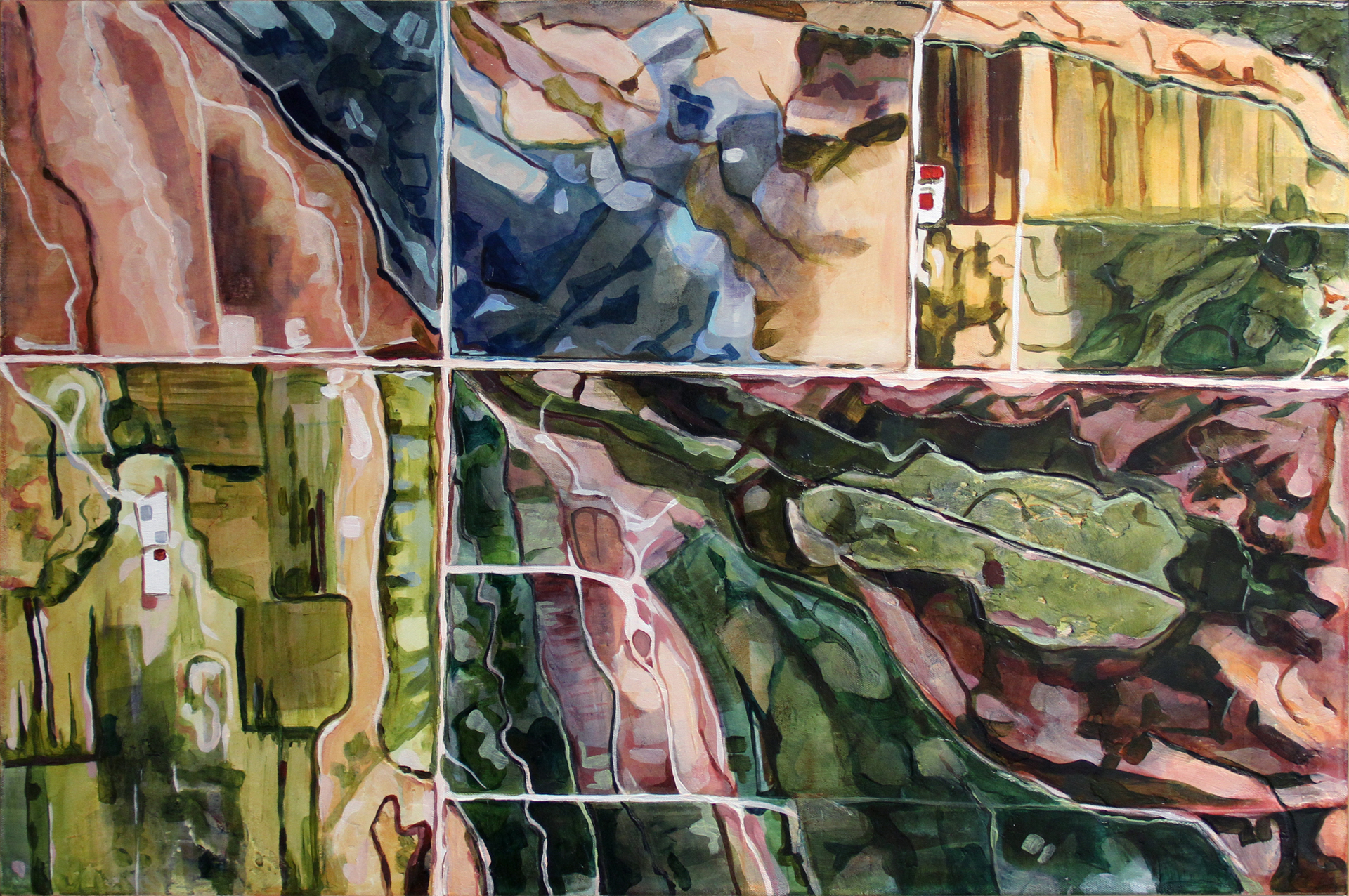 This collection of paintings challenges the limitations of traditional landscape painting by departing from the ground-based perspective and observing the landscape from directly above. From this vantage point, viewers must grapple with our often-conflicted relationship to our environment in the modern world. The paintings imply we are stewards of the land with both rewards and responsibility.